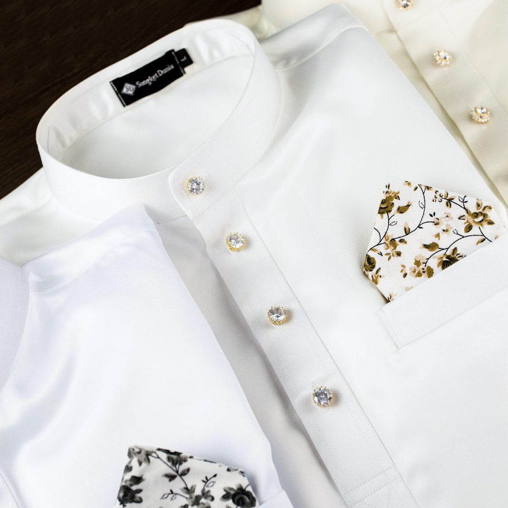 Koleksi baju melayu untuk pengantin lelaki, datang dengan tiga variasi warna - WHITE | OFF-WHITE | CREAM. Tekstil berkualiti, diperbuat daripada premium duches material yang mudah diurus dan kelihatan kemas pada badan si pemakai. Potongan moden slim fit dengan side dan sleeve zip.